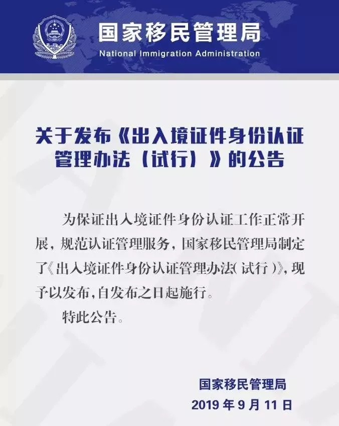 9月11日,中国国家移民管理局出台最新规定,从今年10月起,海外华人做个身份认证,护照能当身份证用。可同内地居民一样享受同等便利。