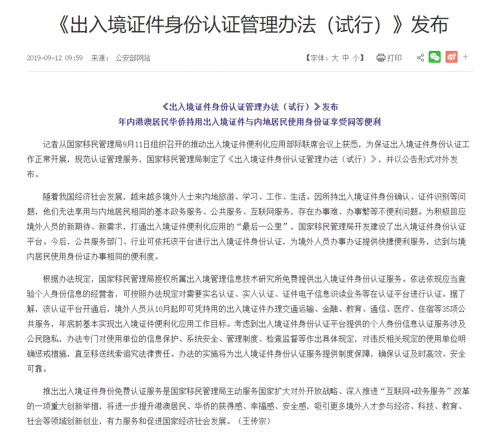 据央视新闻报道,推出出入境证件身份免费认证服务是国家移民管理局主动服务国家扩大对外开放战略、深入推进「互联网+政务服务」改革的一项重大创新举措,将进一步提升港澳居民、华侨的获得感、幸福感、安全感,吸引更多境外人才参与经济、科技、教育、社会等领域创新创业,有力服务和促进国家经济社会发展。