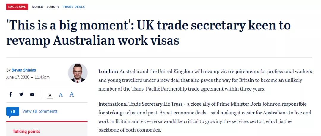 Liz Truss:将改变针对澳洲人的工作签证规定,并称这是一个伟大的时刻。